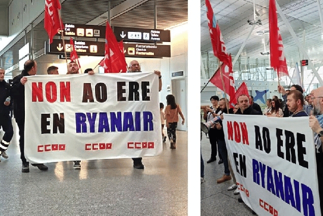 O persoal de terra de Ryanair en Galicia protagonizou unha xornada de folga cunha concentración no aeroporto de Santiago para protestar polo ERE que pretende aplicar a compañía, que afectaría ata o 85% do cadro de persoal. CCOO propón un ERTE temporal mentres duren as obras en Lavacolla.