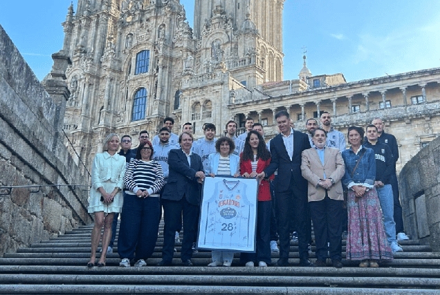 Goretti Sanmartín deu a benvida ao equipo de baloncesto compostelán na praza do Obradoiro, nun encontro previo á celebración do I Torneo Internacional Concello de Santiago.