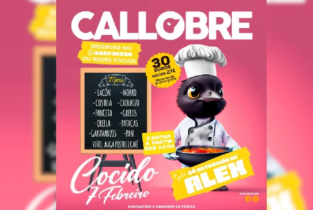 A Comisión de Festas da parroquia de San Xoán de Callobre, en Miño, convoca un xantar a partir das 14.00, con actuación musical do cantante Alex