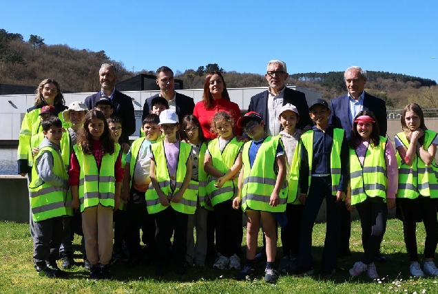 Carmela López e Miguel Fernández percorreron a EDAR xunto a estudantes de Primaria para coñecer o funcionamento do sistema de tratamento da auga