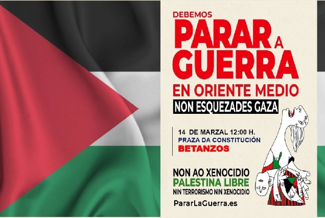 O municipio acollerá o 14 de marzo, ás 12.00 horas, unha concentración diante da Casa Consistorial, na Praza da Constitución, dentro da xornada estatal promovida por Parar la Guerra para reclamar o fin da guerra en Oriente Medio e non esquecer Gaza