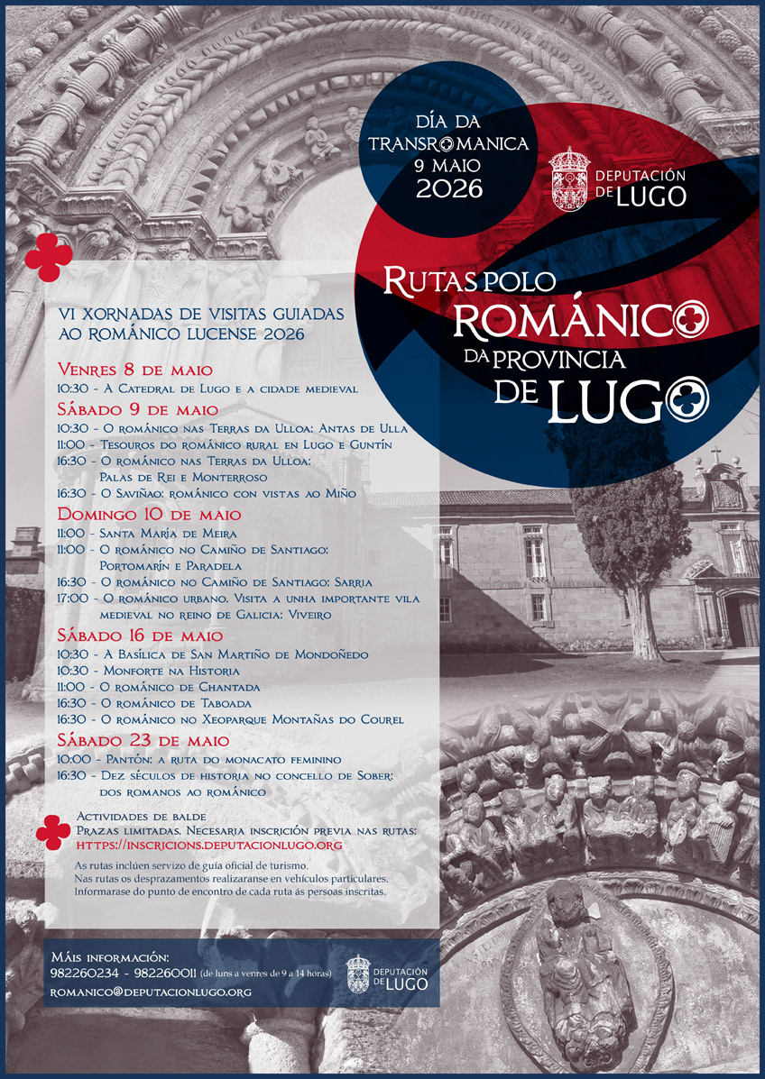 A presidenta da Deputación de Lugo, Carmela López, e a deputada de Réxime Interior, Promoción do Territorio e Turismo, Pilar García Porto, presentaron este venres, no Claustro da Catedral de Lugo, a programación das Rutas polo Románico. Unha iniciativa que a institución provincial organiza por sexto ano consecutivo e que consiste nunha serie de itinerarios gratuítos polo románico da provincia para conmemorar o Día da Transrománica. A primeira das rutas arrancará o vindeiro 8 de maio na capital lucense.