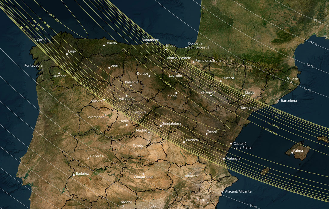 Segundo os datos do Instituto Xeográfico Nacional, o 56,3% do territorio galego terá opción de ver a eclipse total. A provincia de Lugo (provincia) será a máis favorecida, cunha visibilidade que supera o 98% da súa superficie, mentres que Pontevedra (provincia) rexistrará a menor porcentaxe, cun 9,5% dentro da franxa de totalidade.