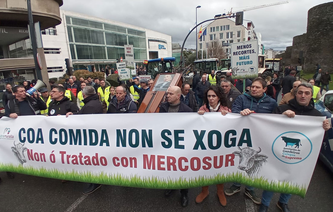 Centos de produtores agrogandeiros, mobilizados polas asociacións Agromuralla e Gandeiros Galegos da Suprema e acompañados por arredor de 50 tractores, saíron este luns ás rúas de Lugo para amosar o seu rexeitamento á posible ratificación do acordo comercial entre a Unión Europea e os países do Mercosur. Segundo denunciaron, trátase dun tratado que tería un efecto moi prexudicial sobre o sector primario, o medio rural e o actual modelo produtivo.